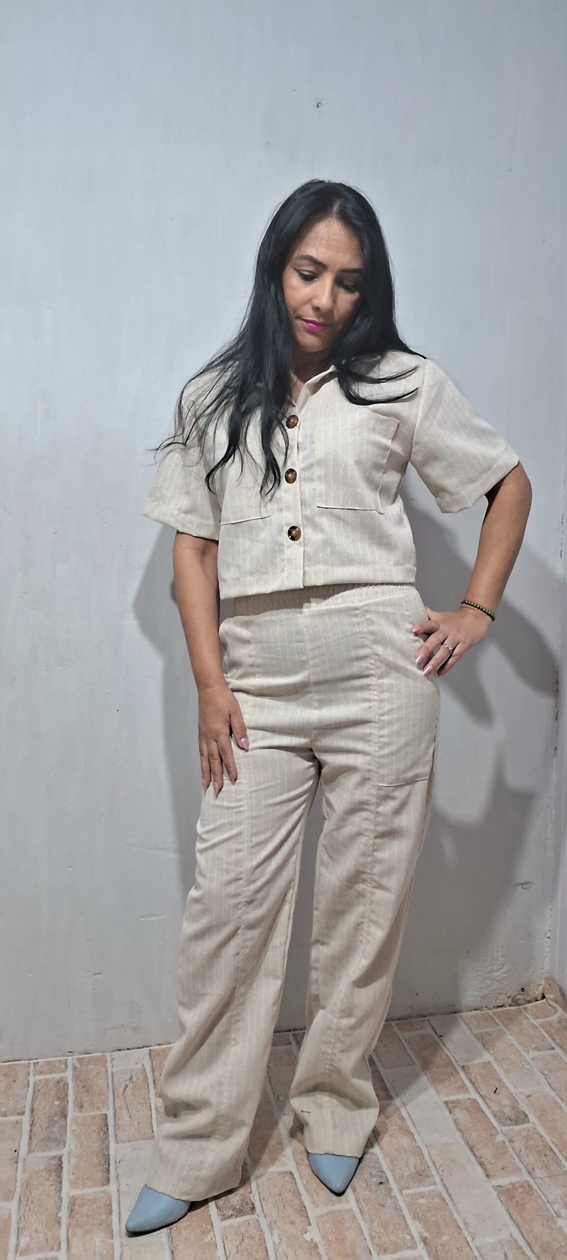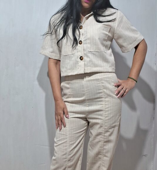 Conjunto alfaiataria cropped com botões e calça mais soltinha com elástico na cintura para ajustar melhor ao corpo