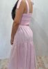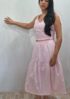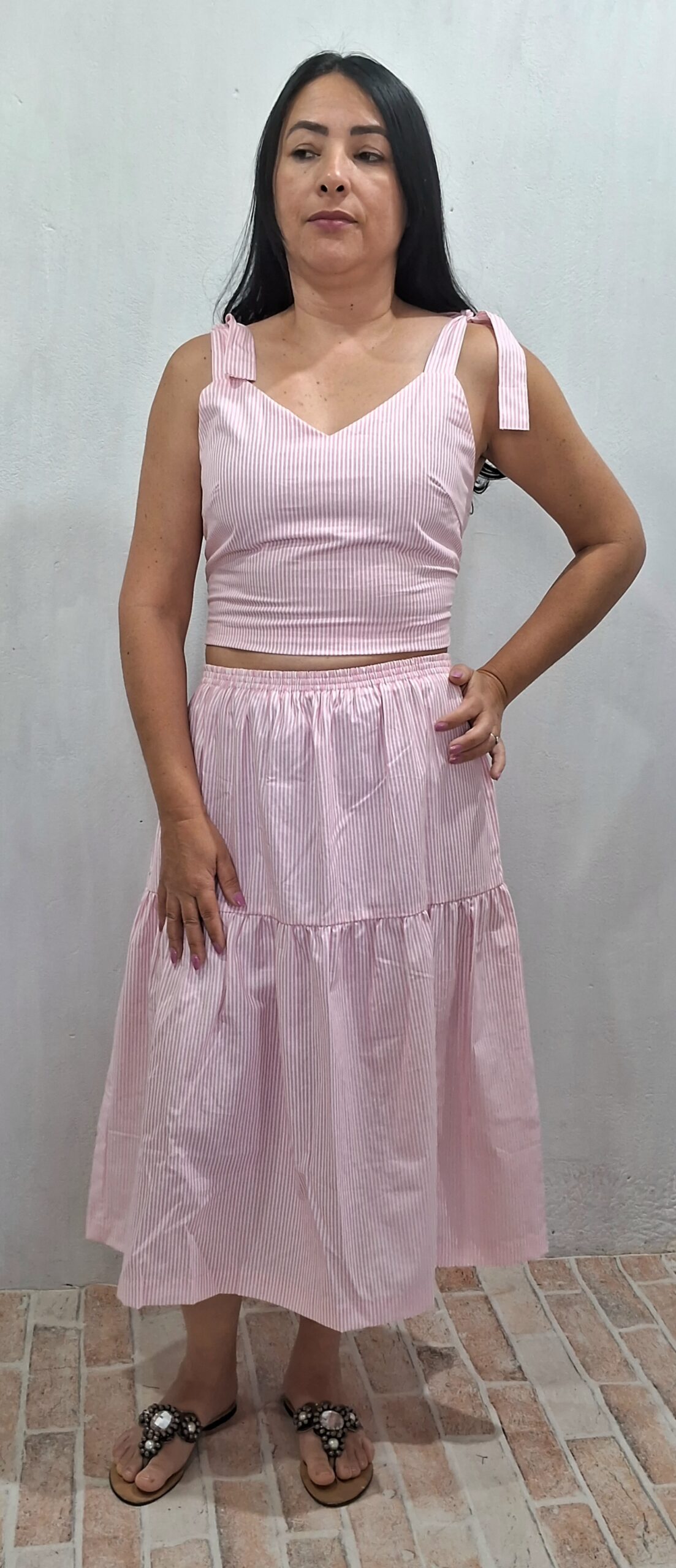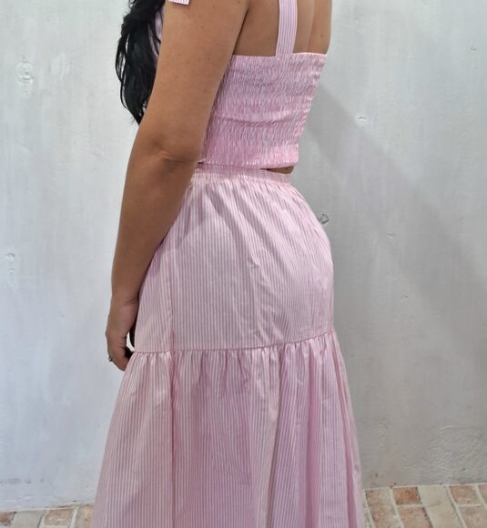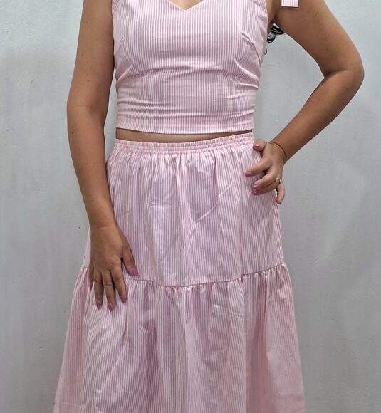 Conjunto cropped e saia listrado na vertical, cropped com lastex atrás para melhor ajuste com alças largas para amarrar nos ombros .saia corte evasê midi com elástico na cintura.