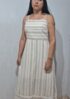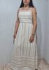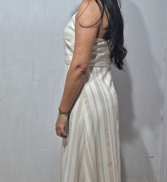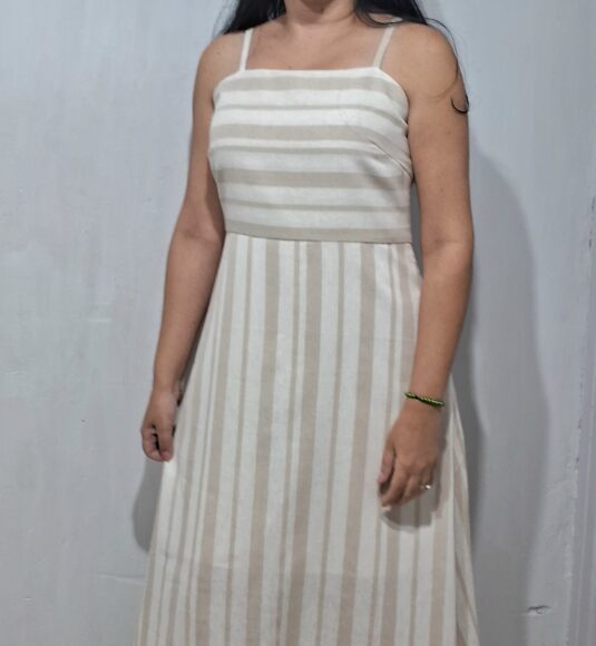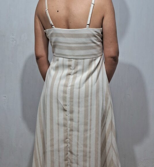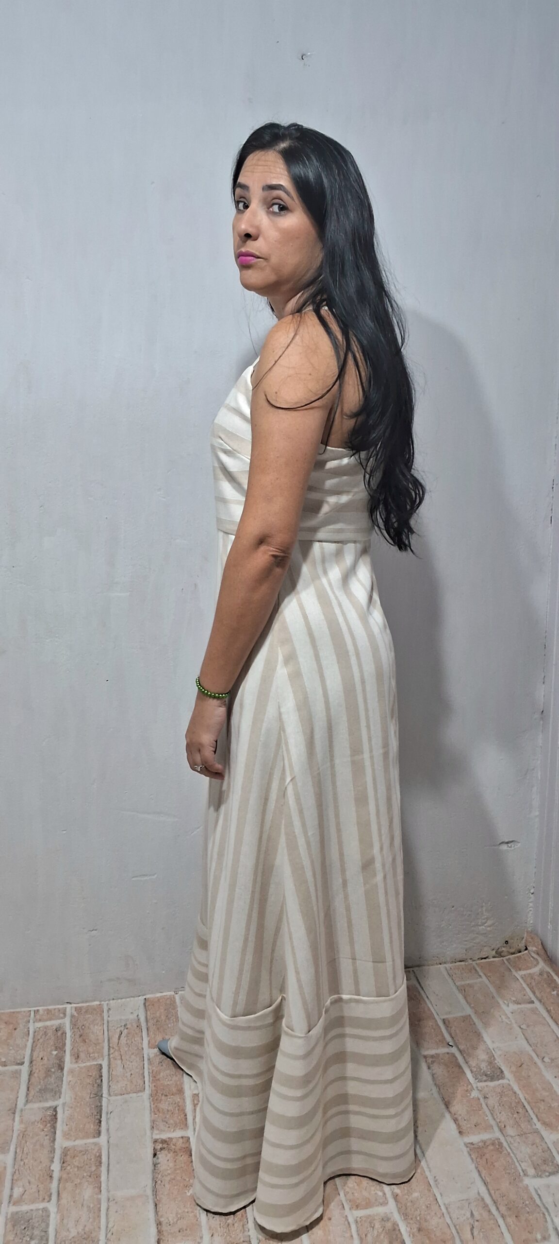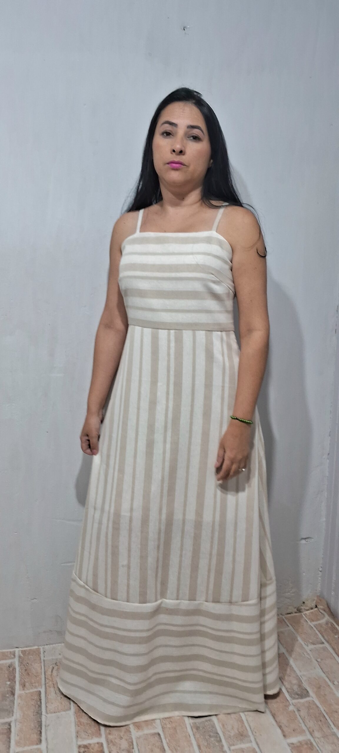 vestido longo com alças largas ,listras horizontal e vertical com ziper invisivel na lateral .